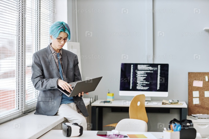 Молодой человек, использующий ноутбук сидит у окна в офисе