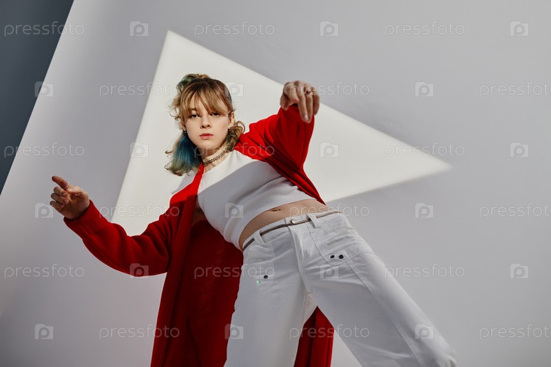 Молодая стильная танцовщица в красном пальто