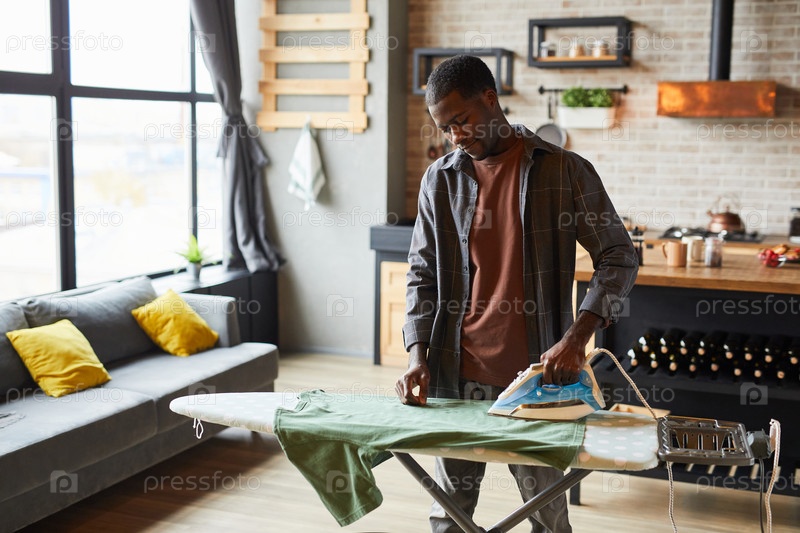 Человек, гладящий одежду дома