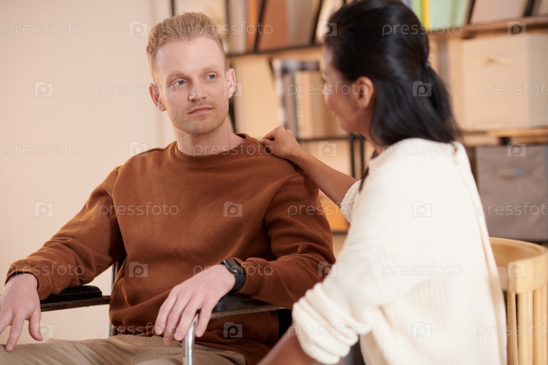 Опекун поддерживает мужчину в инвалидном кресле
