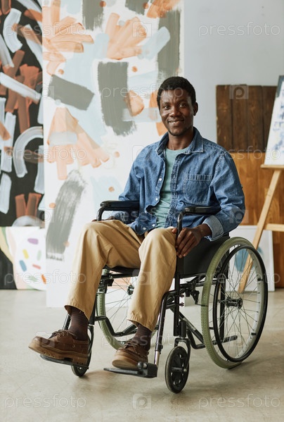 Молодой уверенный в себе художник или ремесленник на инвалидном кресле, сидящий перед камерой