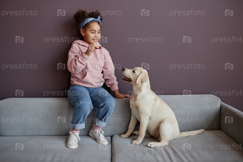 Портрет маленькой чернокожей девочки, играющей с собакой в помещении