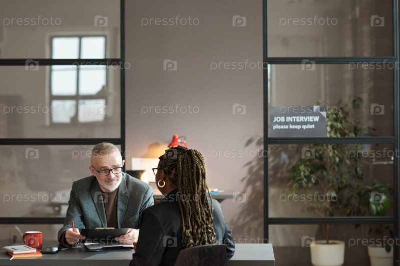 Женщина разговаривает с менеджером на собеседовании