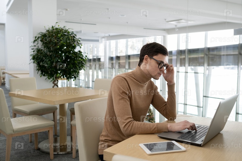 Молодой бизнесмен концентрируется на работе над новым проектом перед ноутбуком