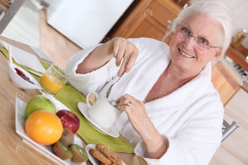 Пожилая женщина завтракает