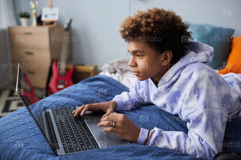 Милый подросток в капюшоне отдыхает на кровати с ноутбуком