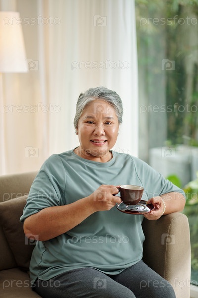 Старшая женщина наслаждается чашечкой кофе