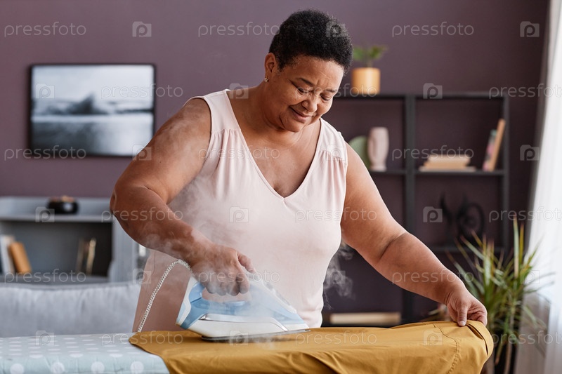 Черная женщина гладит одежду дома и улыбается