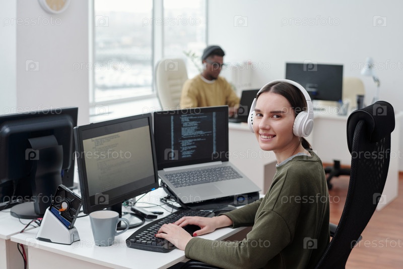 Счастливая молодая женщина-инженер в наушниках, сидящая за столом с компьютером