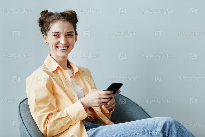 Улыбающаяся молодая женщина с телефоном минимально