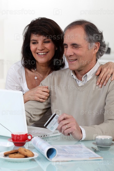 Пожилая пара с кредитной картой сидит за компьютером