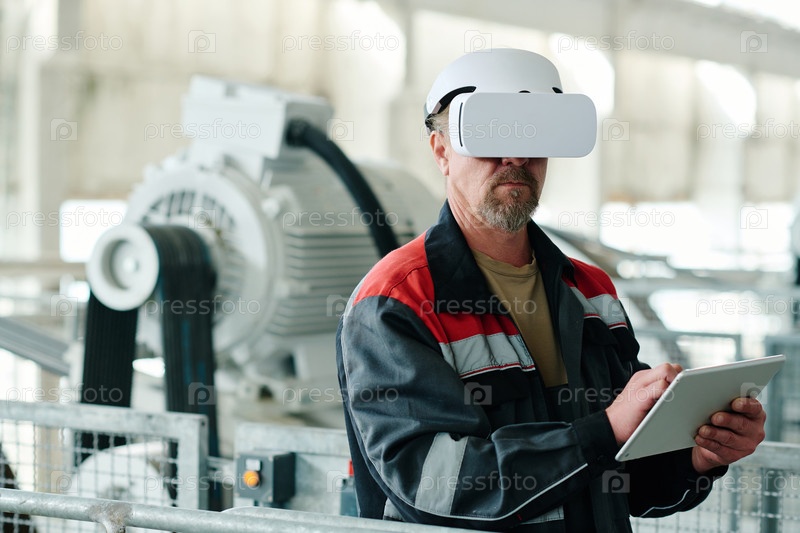 Инженер наблюдает за производством материала с помощью очков VR