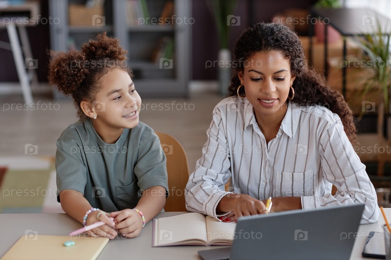 Улыбающаяся чернокожая девочка учится дома и слушает мать или репетитора