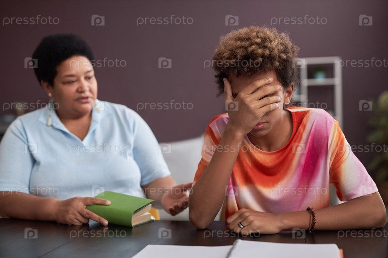 Стыдливый подросток скрывает свое лицо в руках, пока зрелая женщина обличает его