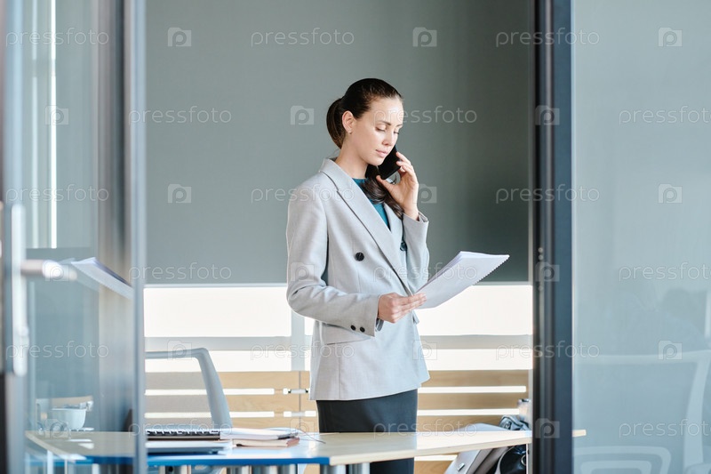 Молодая самоуверенная предпринимательница в костюме, разговаривающая по мобильному телефону