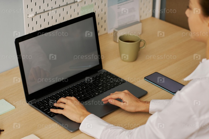 Близкий снимок молодой женщины, печатающей на клавиатуре ноутбука