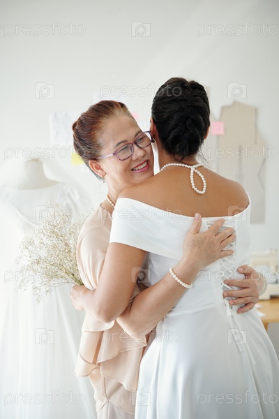 Мать и дочь обнимаются перед свадьбой