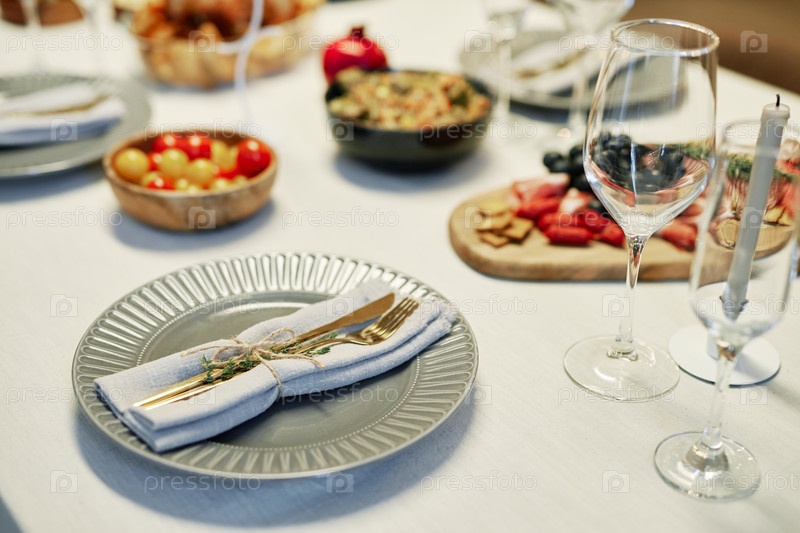 Нож, вилка и зеленая пряная трава на сложенном салфетке связаны вместе нитью