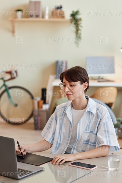 Молодая женщина использует ручку-таблет для цифрового дизайна