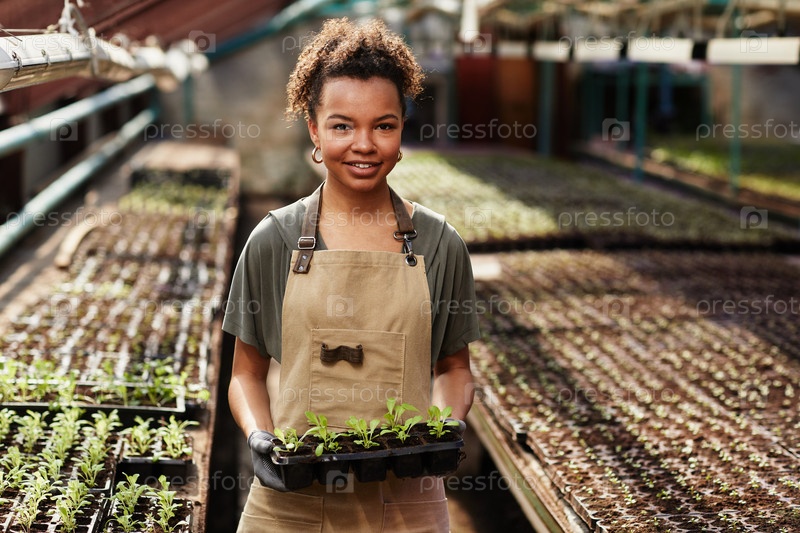 Молодая успешная афроамериканка, работающая в теплице с саженцами