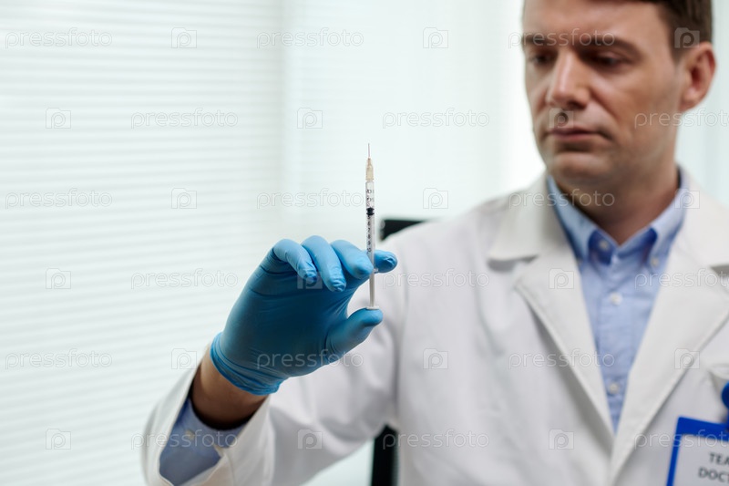 Хирург смотрит на шприц с анестетиком