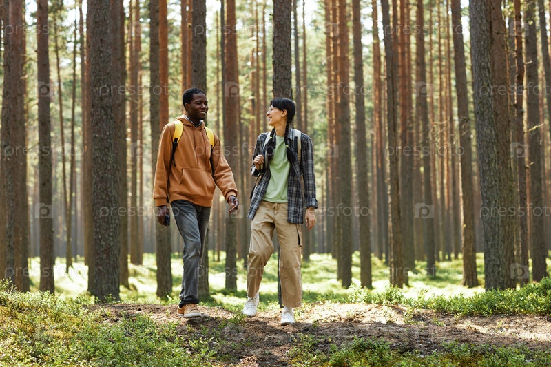 Молодая пара гуляет по лесу