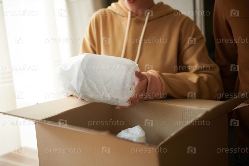 Женщина распаковывает посылку дома