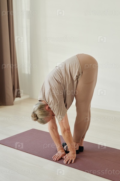Пожилая пенсионерка в спортивной одежде наклоняется вперед и отворачивается