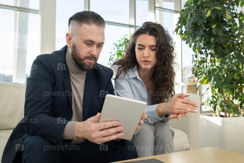 Уверенный в себе среднего возраста генеральный директор высокотехнологичной корпорации, объясняющий данные коллеге