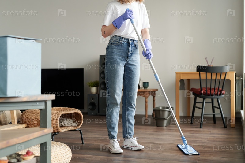 Женщина вытирает пол мопой