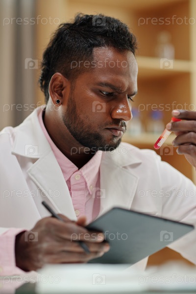 Пенсивный ученый работает с образцами крови