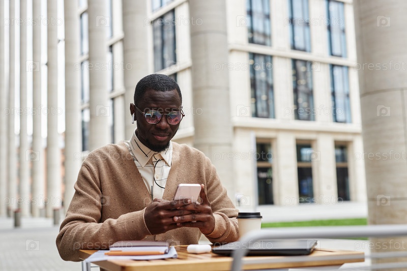 Серьезный бизнесмен в наушниках и тихом роскошном наряде с помощью смартфона