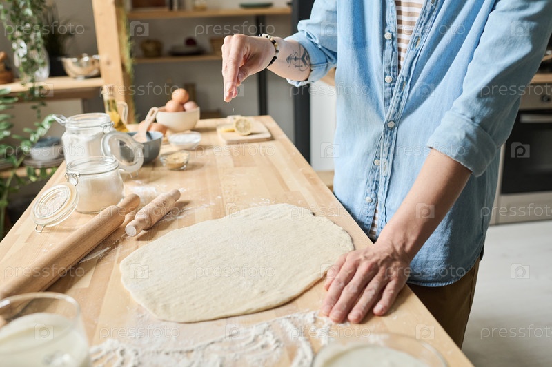 Женщина наливает муку на тесто за столом