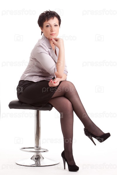 Взрослая бизнес-леди сидит на стуле на белом фоне