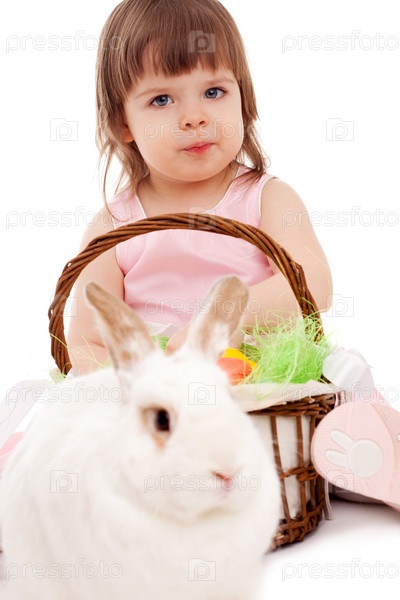 Девочка играет с пушистым пасхальным кроликом