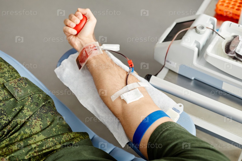 Военный человек сдает кровь в клинике Близкий снимок