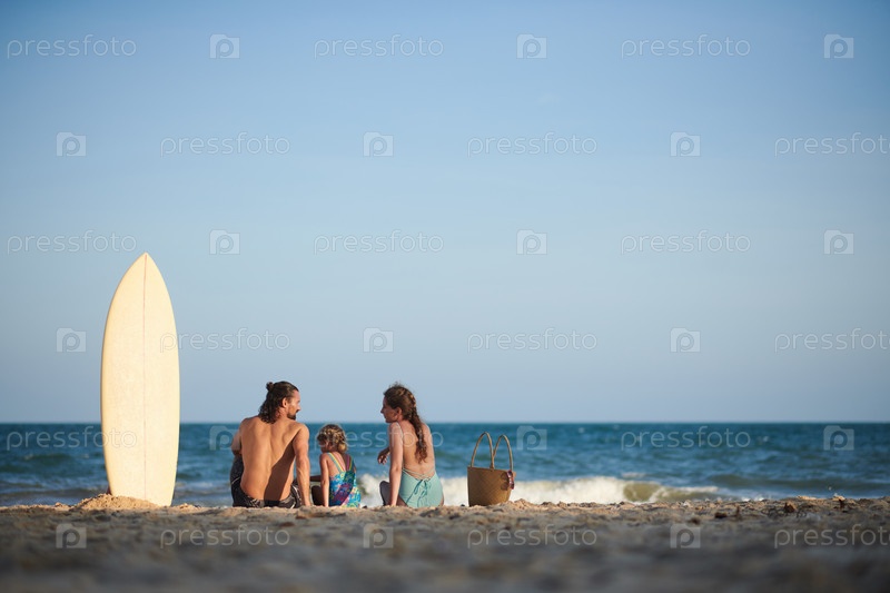 Семья отдыхает на морском пляже