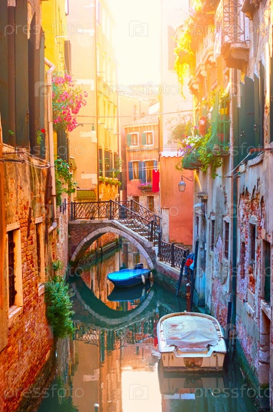 Живописный небольшой канал с мостом и лодками в Венеции