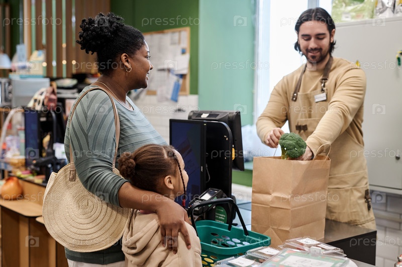 Кассир в супермаркете помогает молодой матери с продуктами