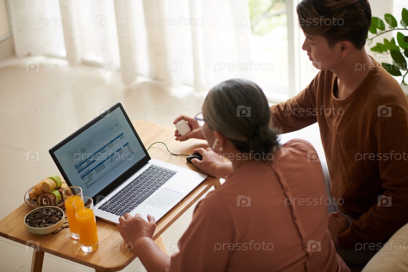 Старшая женщина оплачивает счета онлайн