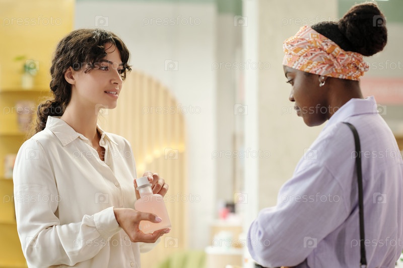 Молодая продавщица показывает клиенту пластиковую бутылку с средствами для удаления макияжа