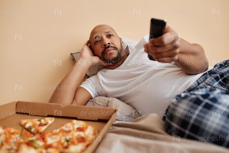 Скучный взрослый мужчина смотрит телевизор дома и лежит в постели с пиццей