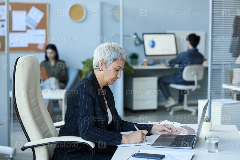 Старшая деловая женщина, работающая с ноутбуком за столом в офисе