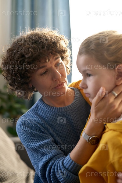 Заботливая мать разговаривает со своим сыном