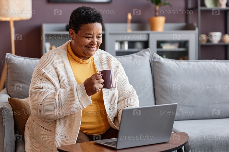 Чернокожая женщина использует ноутбук дома и наслаждается чашечкой кофе