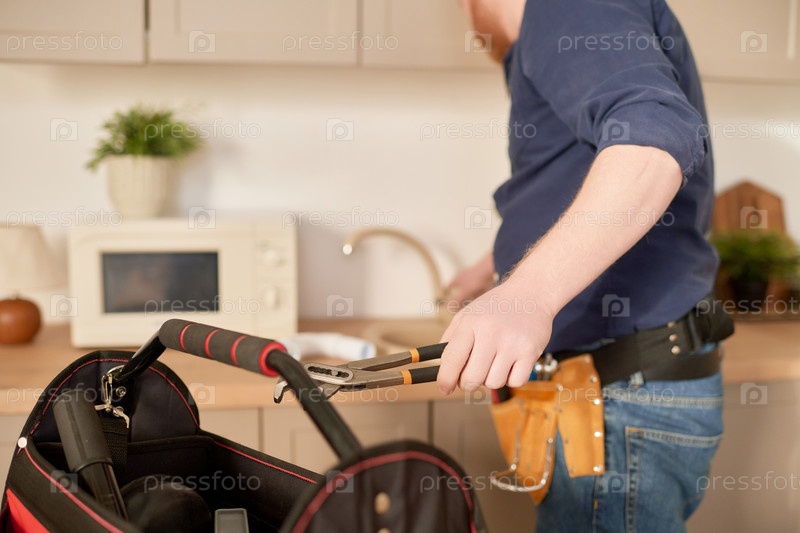 Ремонтник использует инструменты, чтобы починить раковину