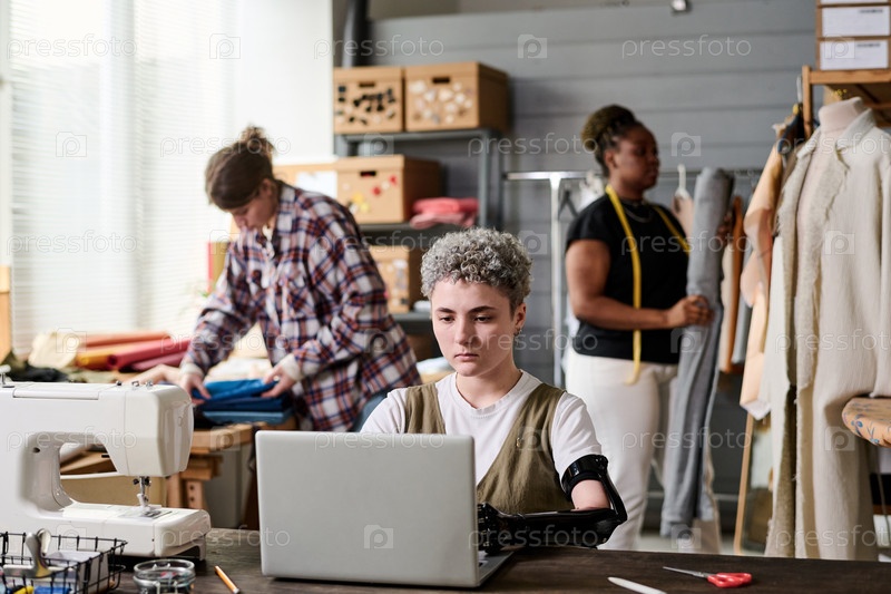 Молодая серьезная швейщица или дизайнер моды, работающая перед ноутбуком
