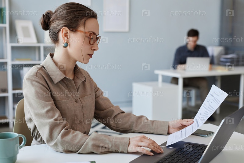 Боковой вид элегантная молодая женщина в очках просматривает документацию в офисе
