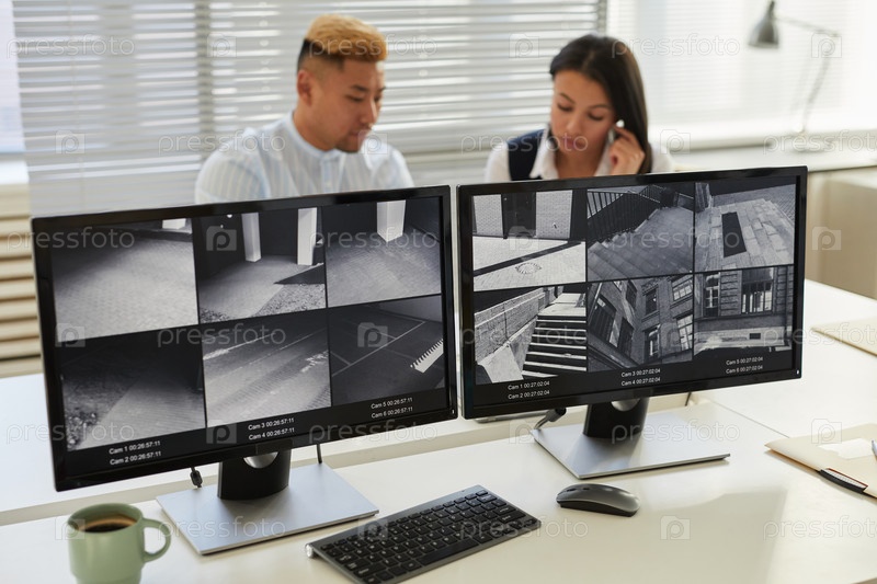 На заднем плане изображение двух компьютерных экранов с несколькими камерами видеонаблюдения