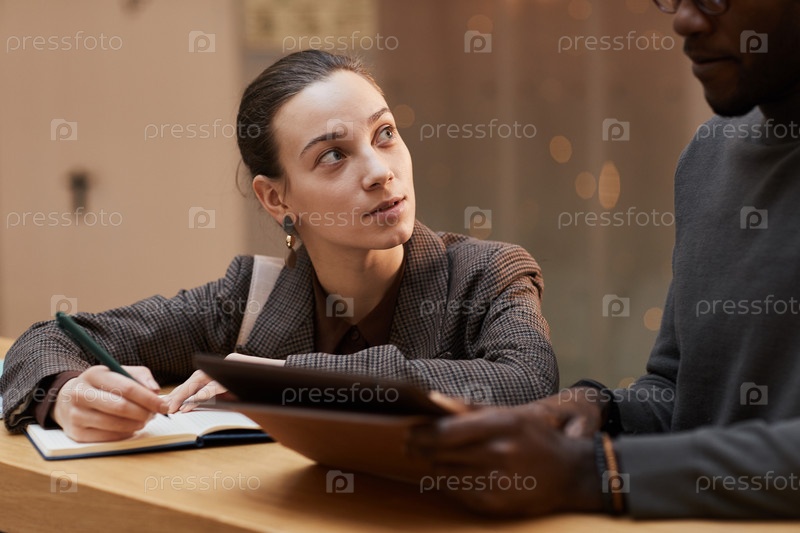 Молодая женщина делает заметки с менеджером